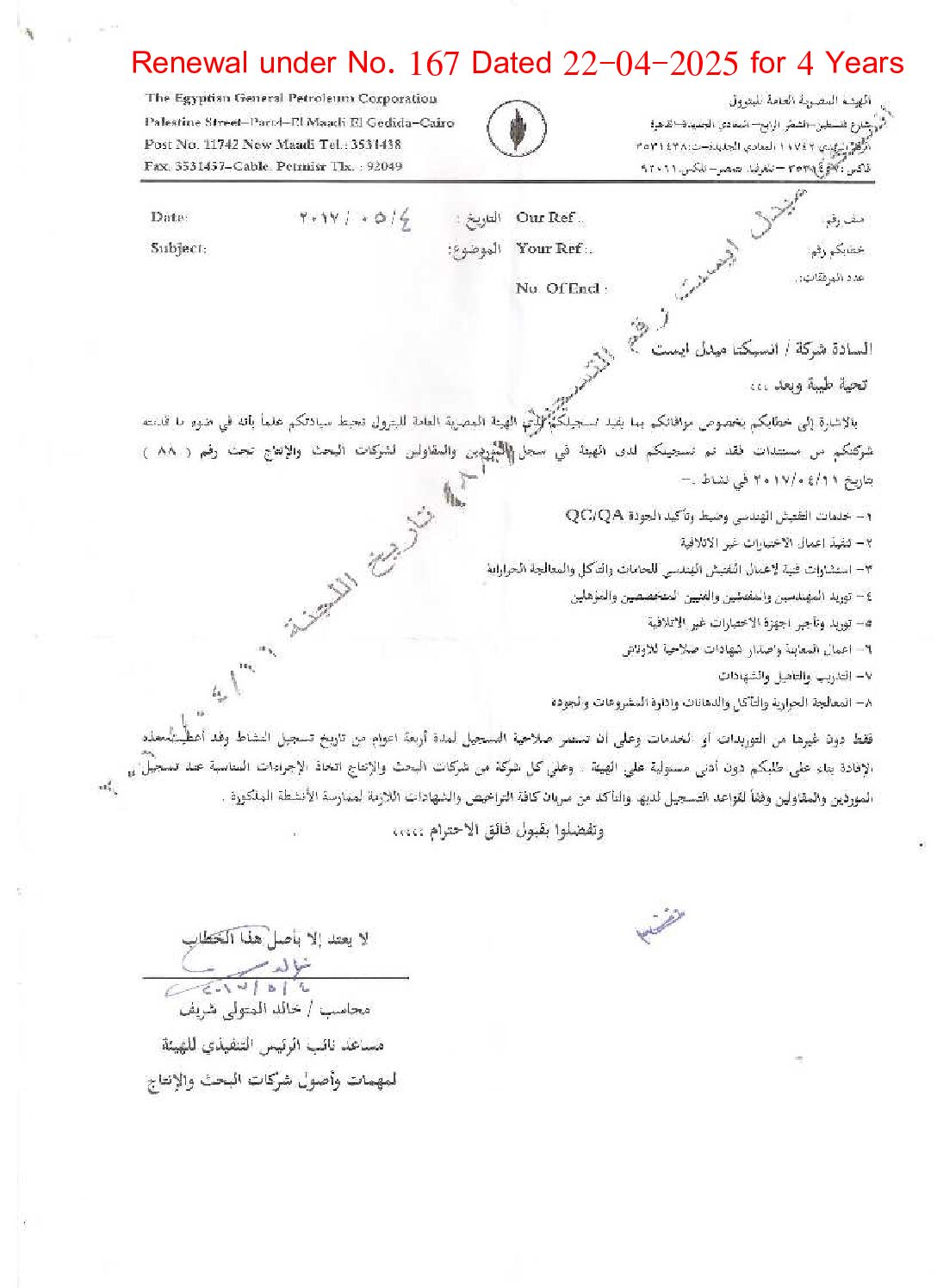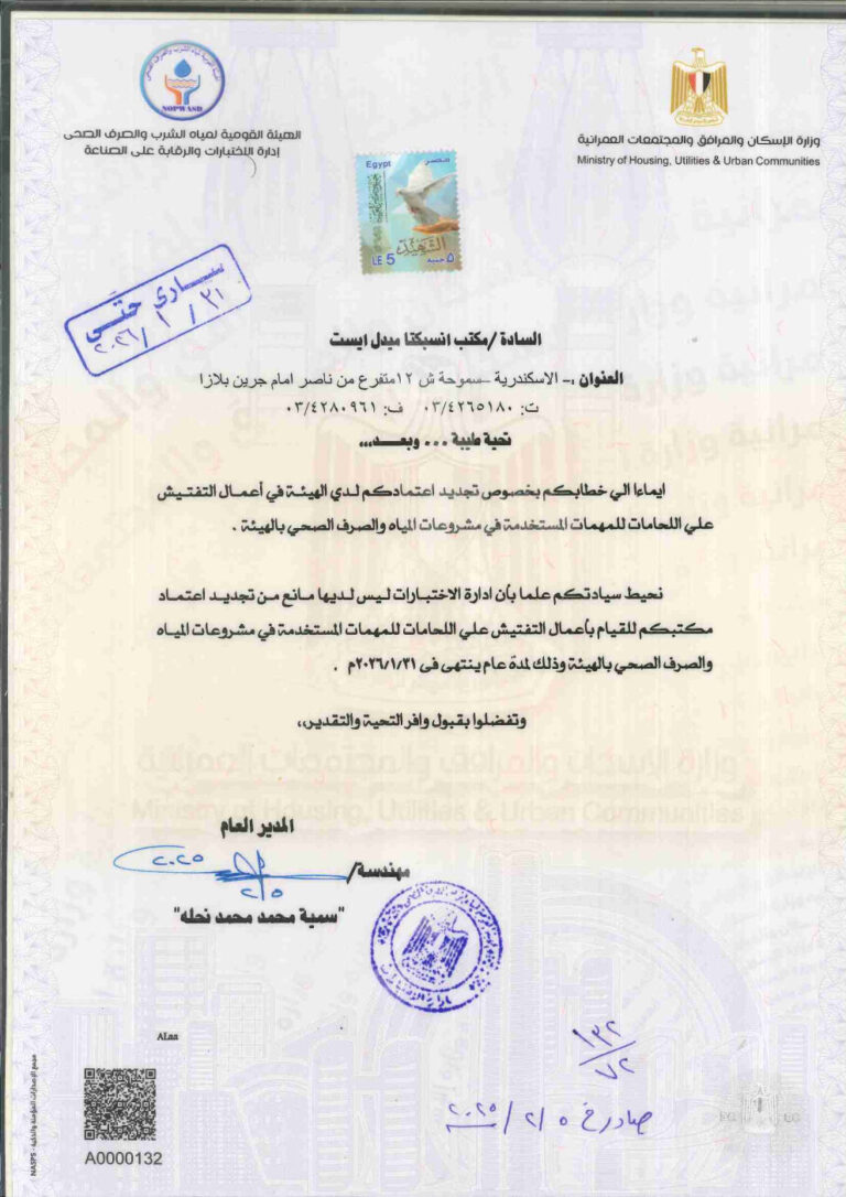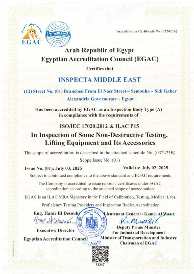INSPECTA Middle East is proudly registered with the Egyptian General Petroleum Corporation (EGPC) under No. 24 dated 11/05/2021, and certified under LEEA No. 1580 and ISO 9001:2015. Our certifications underscore our commitment to excellence and our adherence to the highest industry standards.